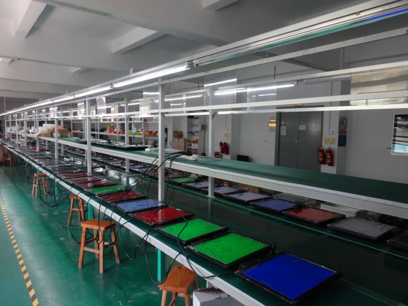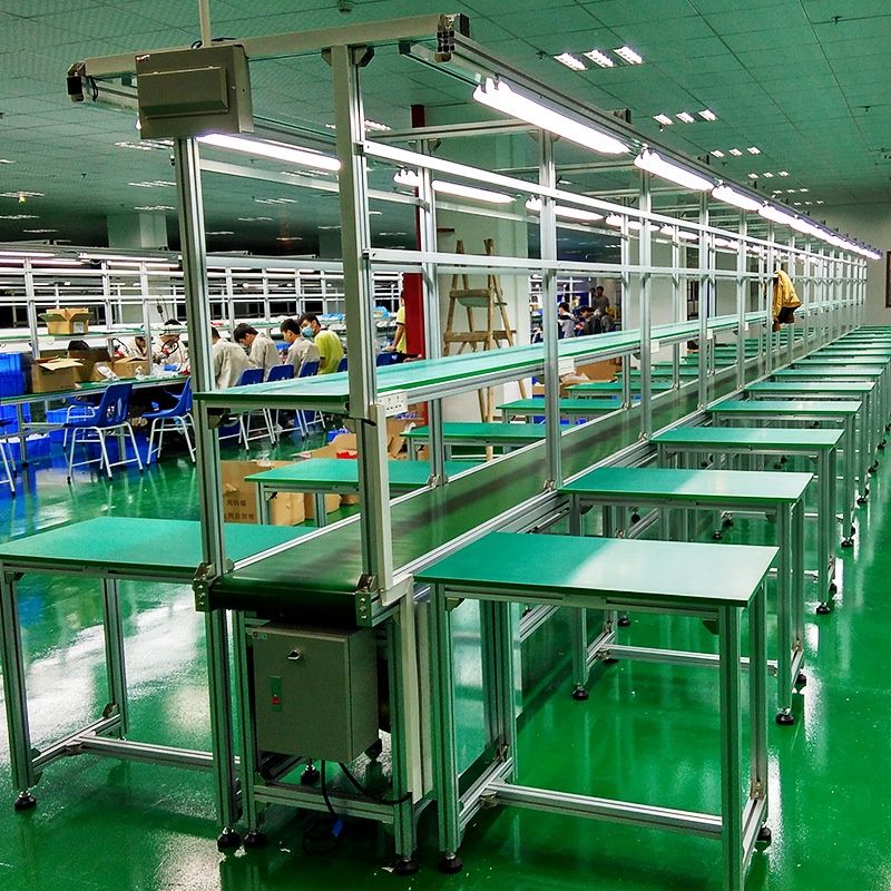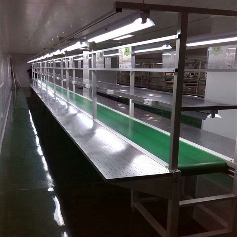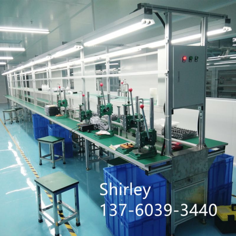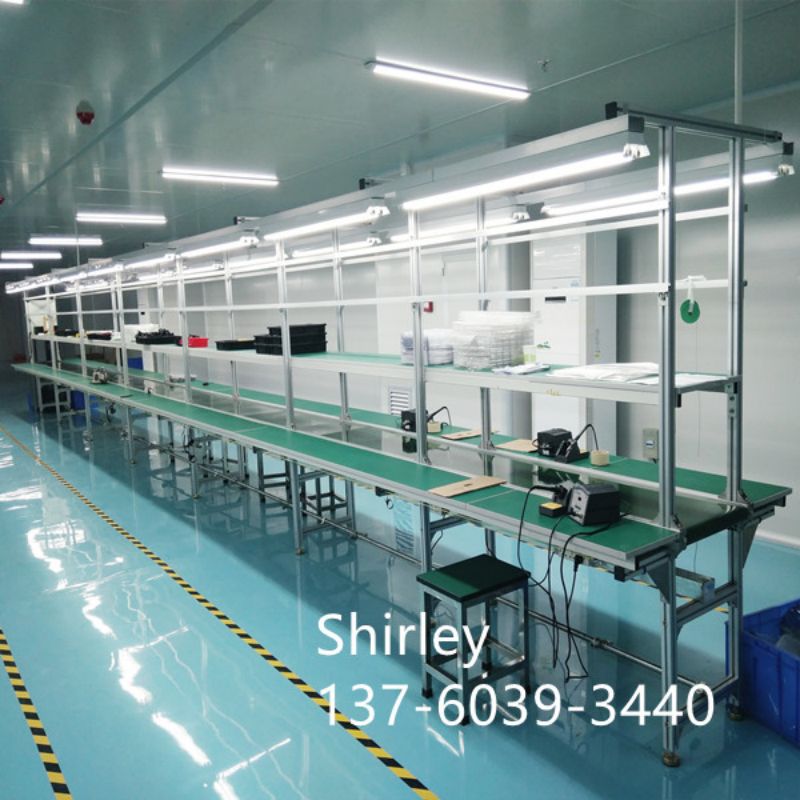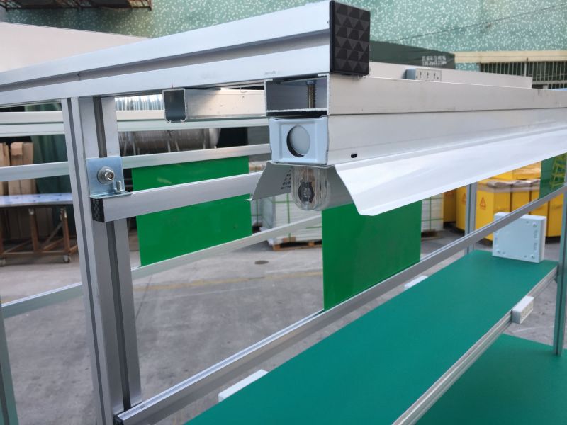 HDL-B3 assembly line is suitable for battery pack assembly line, CCTV assembly line,electronics assembly table, which mainly green PVC belt conveyor, green pvc assembly line, green belt conveying, power conveyor,pvc flat conveyor belt systems. There is one running conveyor and products parts are moving on the belt conveyor, belt conveyor systems. Operators are sitting at two sides of the assembly line, they do the assembling jobs on workbench, which greatly improves the production efficiency. The assembling table material is stainless steel material. The exhaust system will be set for soldering. This conveying table,belt lcd panel assembly line,assembly line table, assembly line workable can be added air compressor air pipe, lamps, hanger for screwdrivers, products processing pocket structure, storage shelf, working table, sockets. You can choose according to your needs. This type assembly line is easy to operate and cost is competitive.